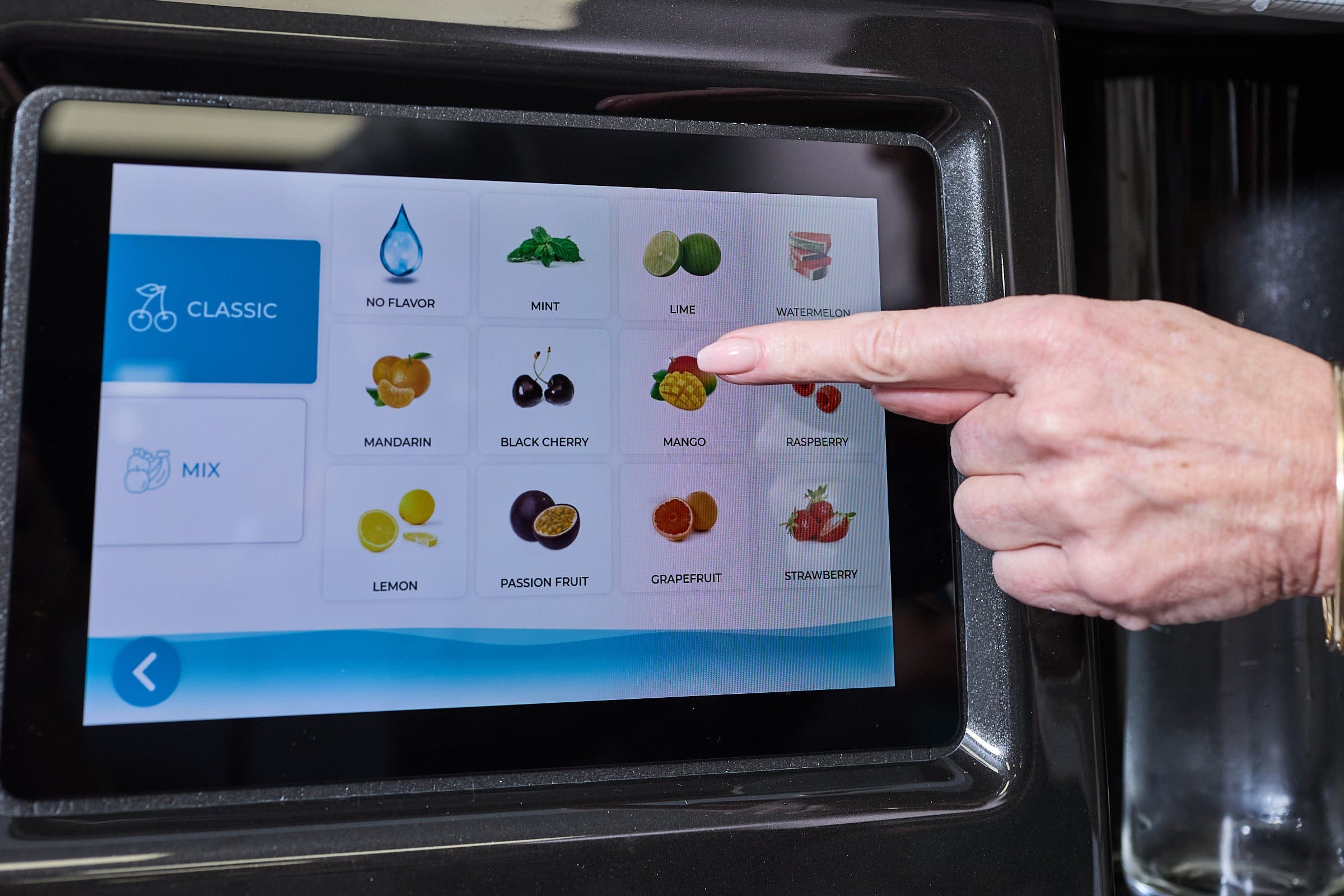 The touchscreen guides users through still or sparkling choices, flavor options, and enhancements, making it easy to build a personalized beverage in seconds.
